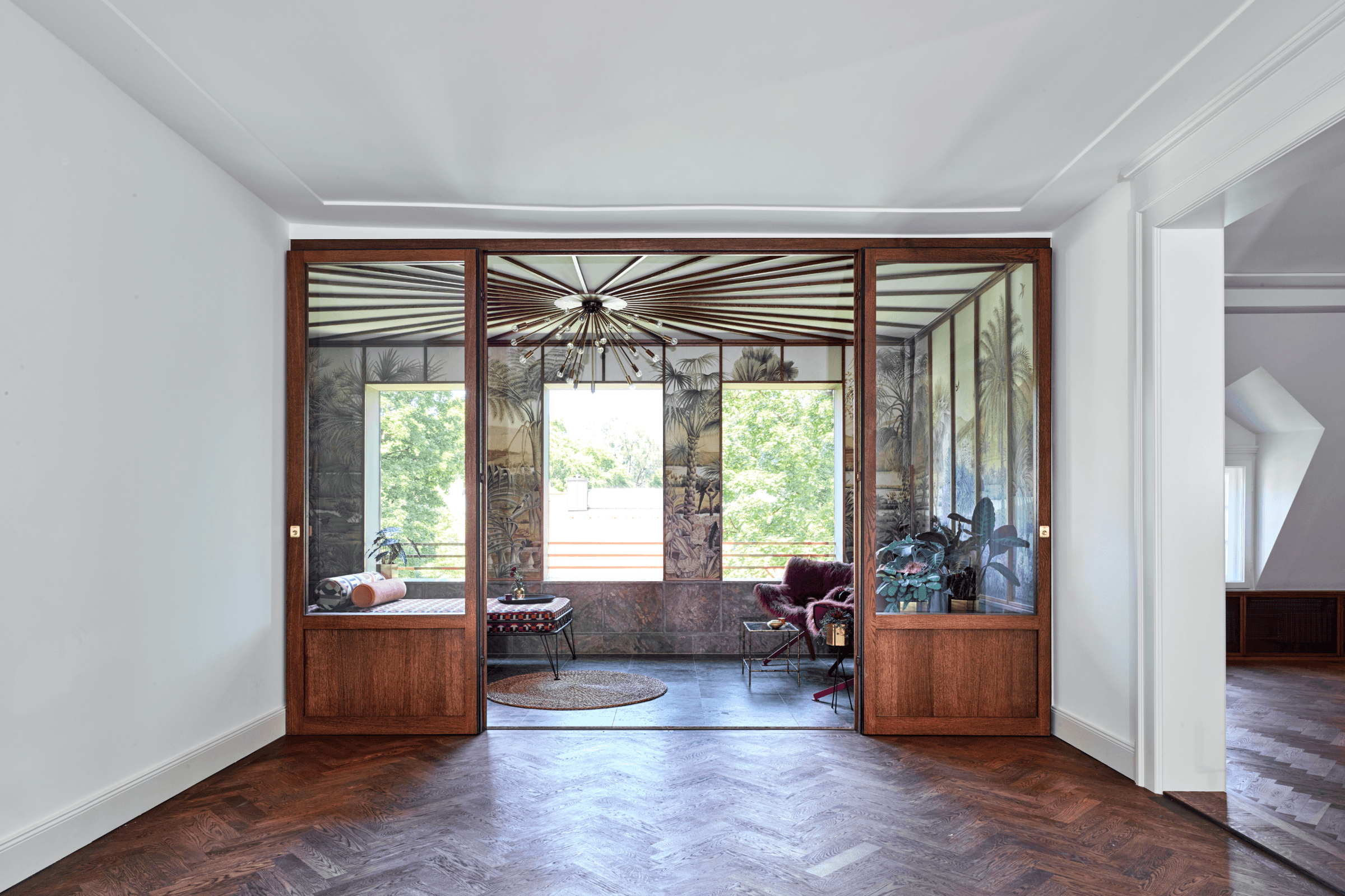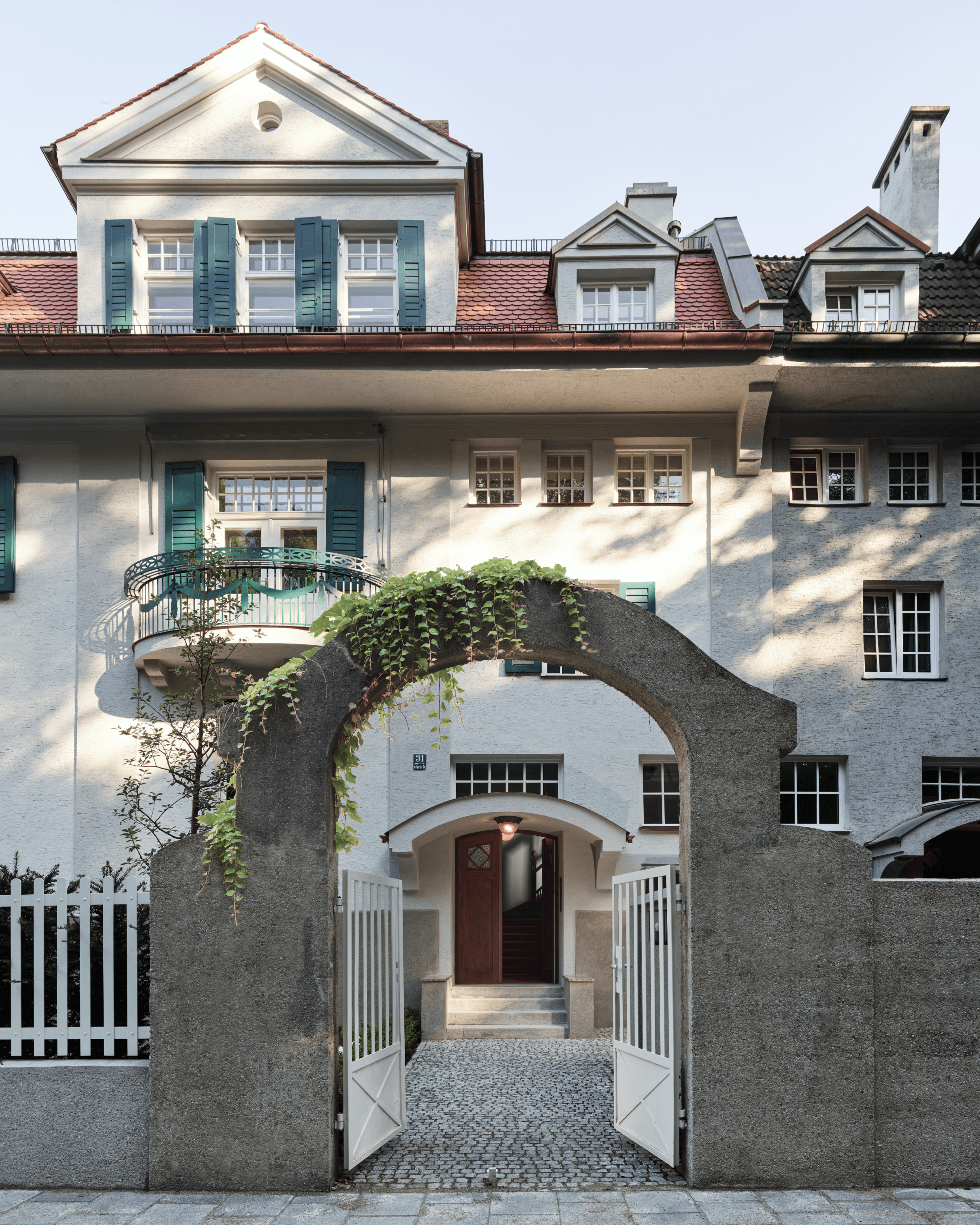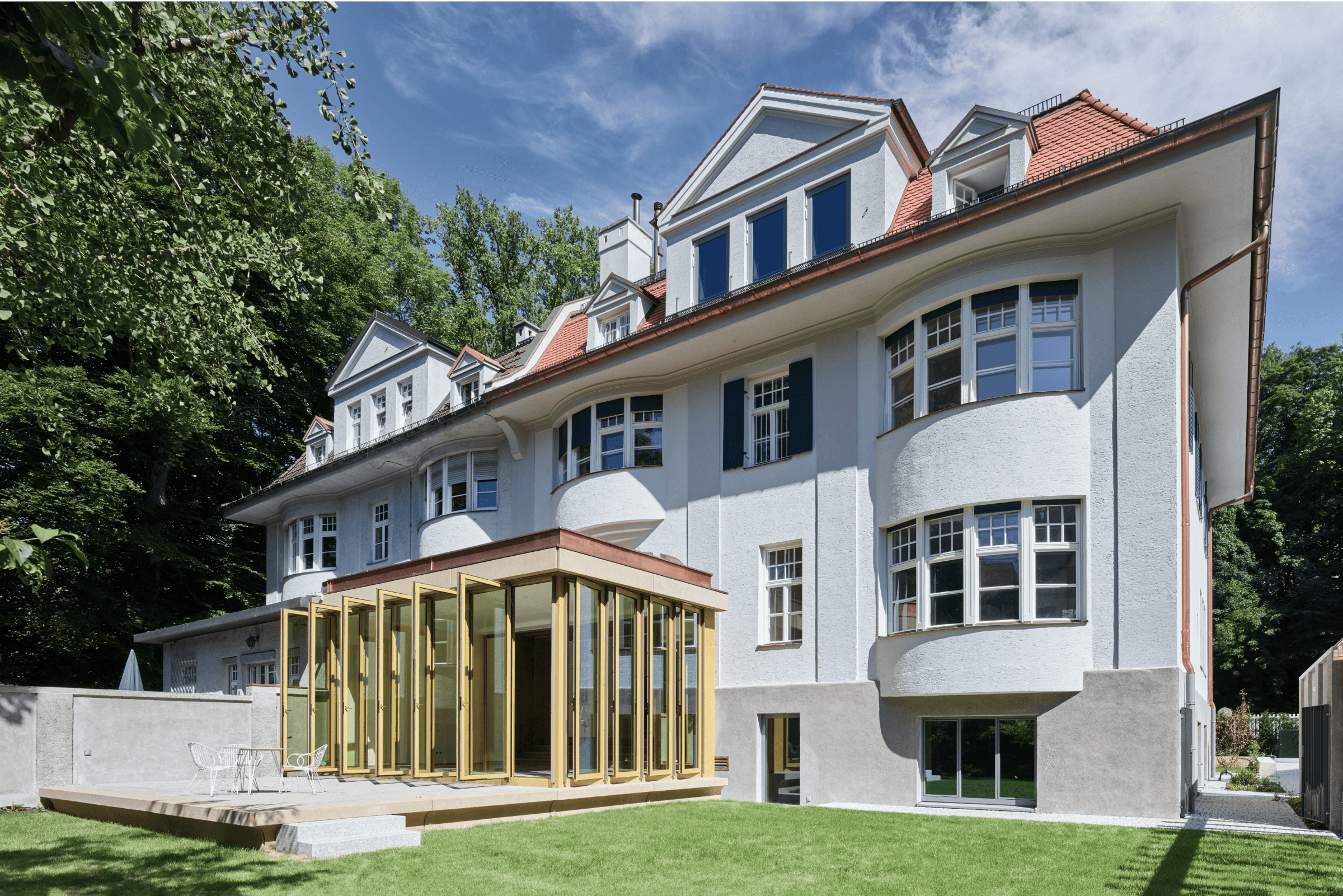 Die Um- und Ausbauten in den drei nunmehr sehr großzügigen Wohnungen nehmen die historische Formensprache behutsam auf. Ein zweiter eigene Hauseingang mit Lift in die oberste Wohnung und die Orangerie im Garten, welche die Wohnräume im Hochparterre erweitert bilden mit dem denkmalgeschützten Bestand eine neue Einheit. Entlang der historischen Bestandsmauer entstanden zudem noch vier Unterflurparker.