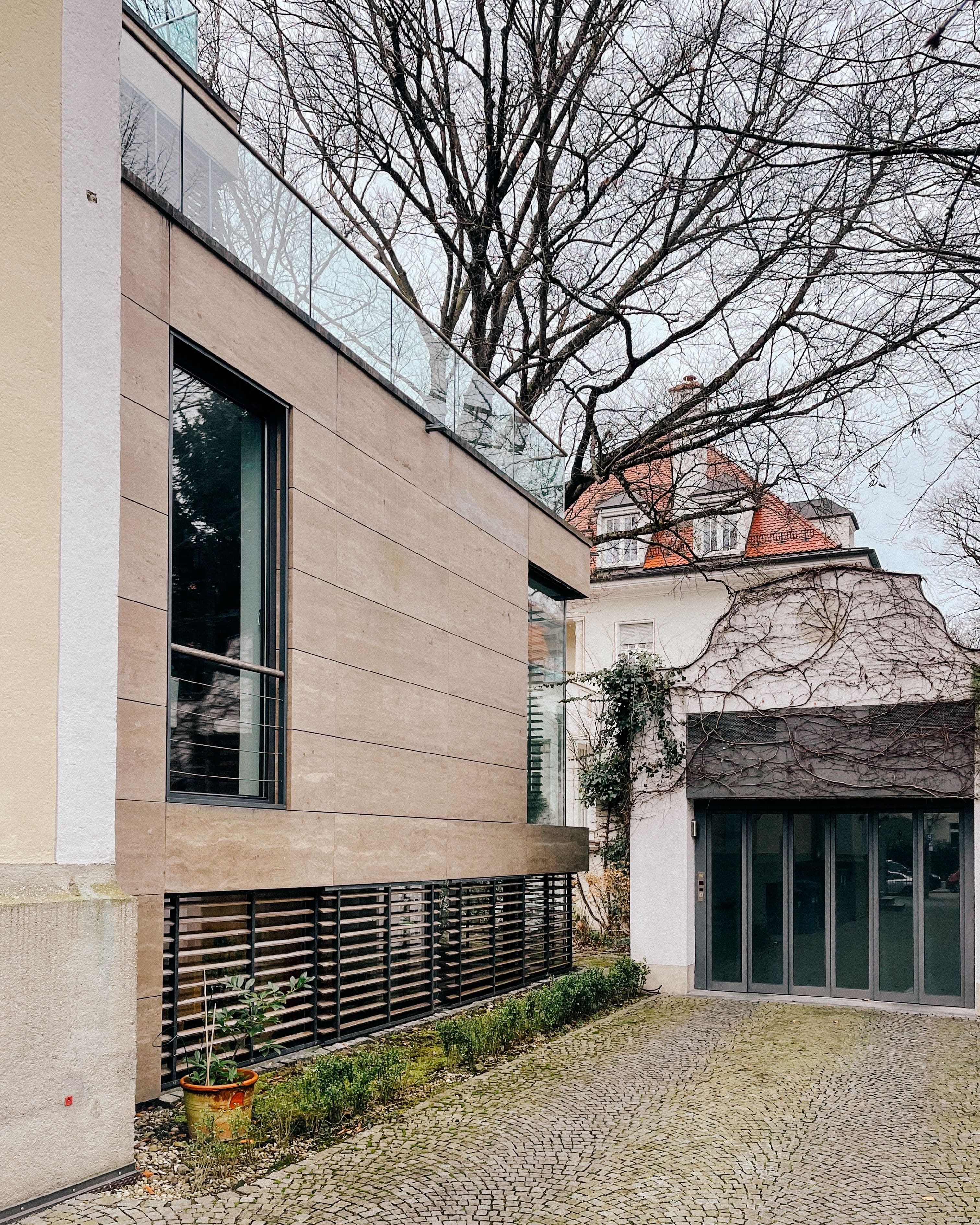 Bei der Konzeption des Erweiterungsbaus lag ein besonderes Augenmerk darauf, eine stimmige Verbindung zwischen historischer Bausubstanz und zeitgemäßer Architektur zu schaffen, sich jedoch in der Materialwahl klar abzugrenzen. Daher wurde der zum Garten gelegene Neubau mit Natursteinplatten aus Travertin Noce verkleidet und großzügig verglast. Der prekären Parkplatzsituation wurde mittels einer kompakten Tiefgarage Rechnung getragen, der Autolift konnte in die ehemalige Einzelgarage integriert werden.