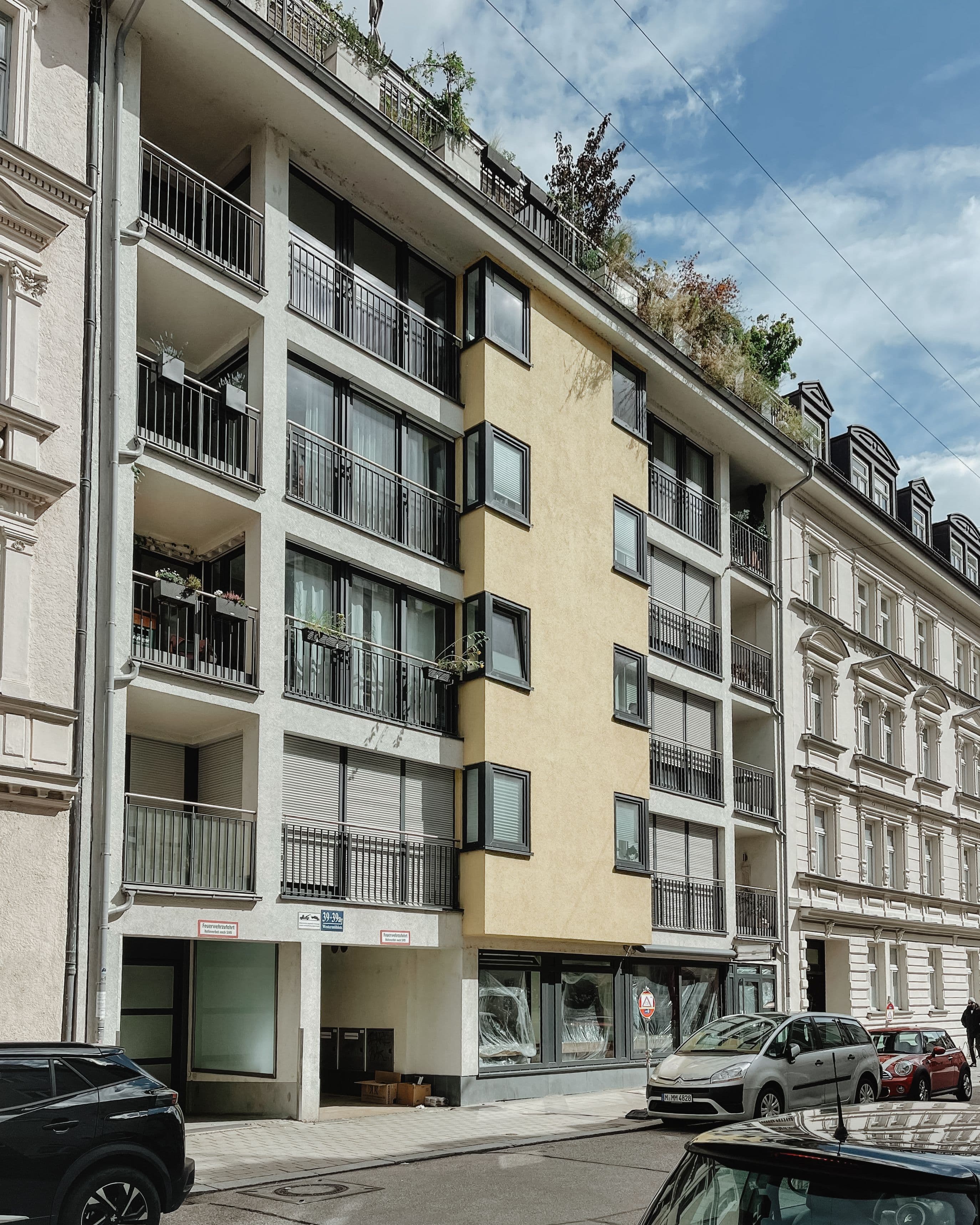 Ein Ort mit einer Gastro: das Projekt in der Westermühlstraße, mitten im lebendigen Glockenbachviertel, markierte meinen Einstieg in den innerstädtischen Wohnungsbau mit der Baustil Wohnbau als Auftraggeber.